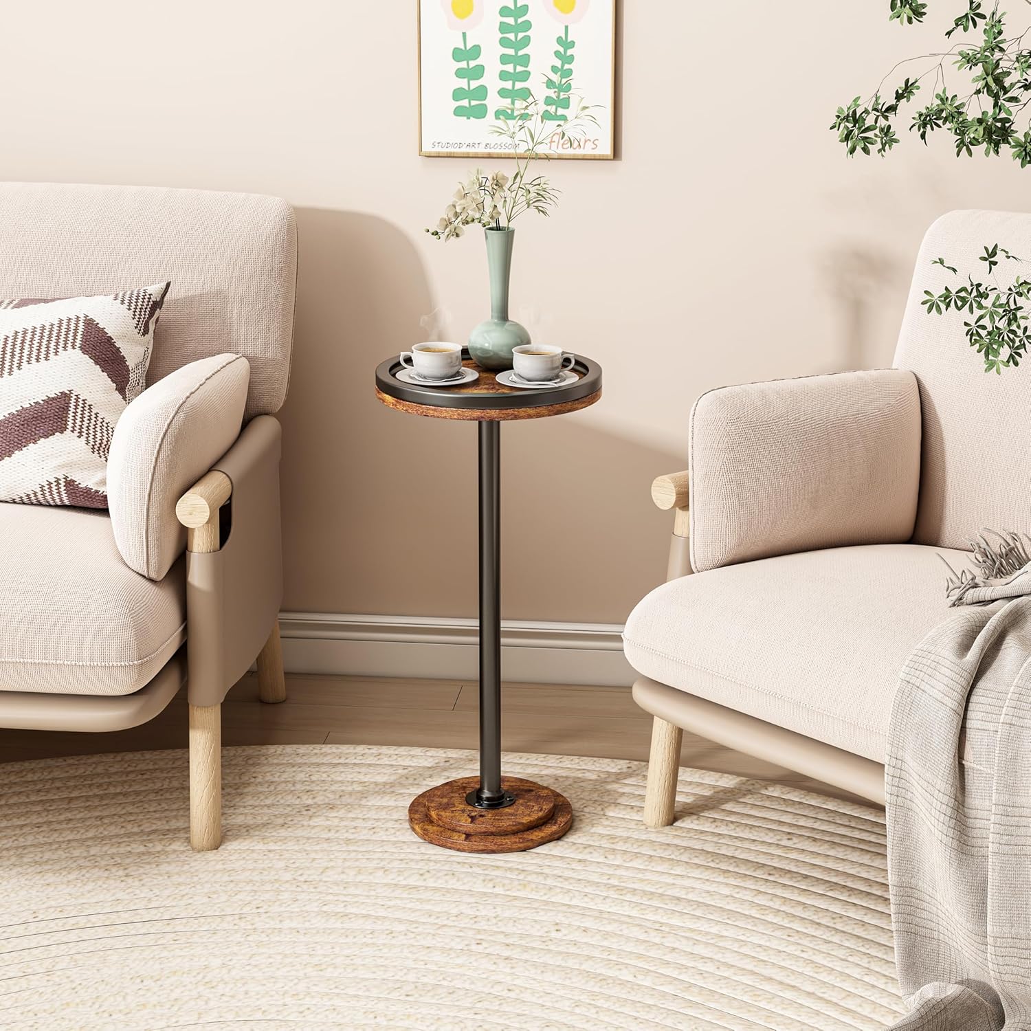 A small drinks table is an ideal place to relax with a cocktail or coffee after a long day of hard work. Added to the warm colors are black metal pipes that give the small tea a permanent charm. It is used not only for drinking beverages but also as a prop, a perfect place to drop books while sleeping. No matter where it is placed at home, it is an important statement.
