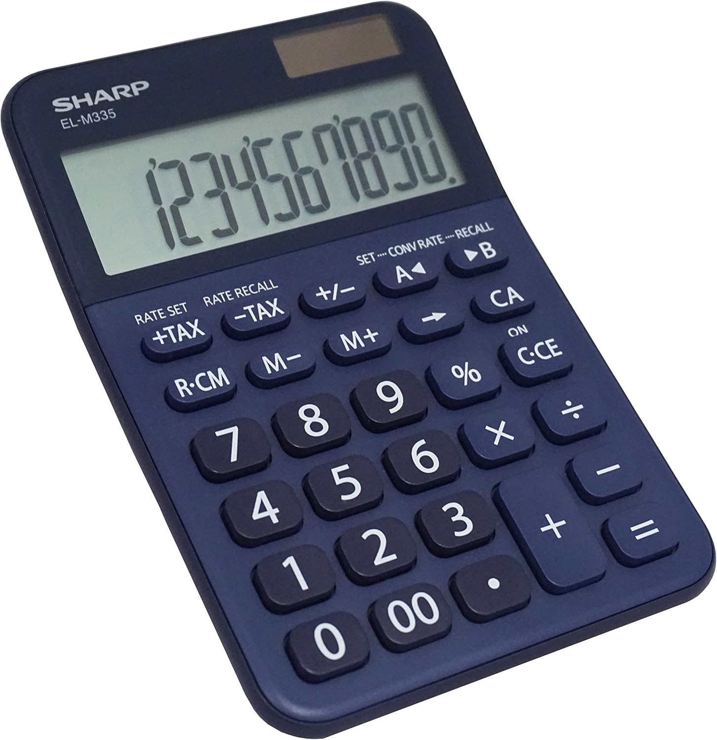 10 digit professional desktop calculator is perfect for business professionals at home or in the office. The EL-M335 is finished in a dark blue design and features a large angled LCD display and durable plastic keys. Functions include currency conversion functions, automatic tax keys, percent key, backspace key, 3 key independent memory, extra-large plus key, sign change, and automatic power down. Operates on twin power (solar/battery backup).